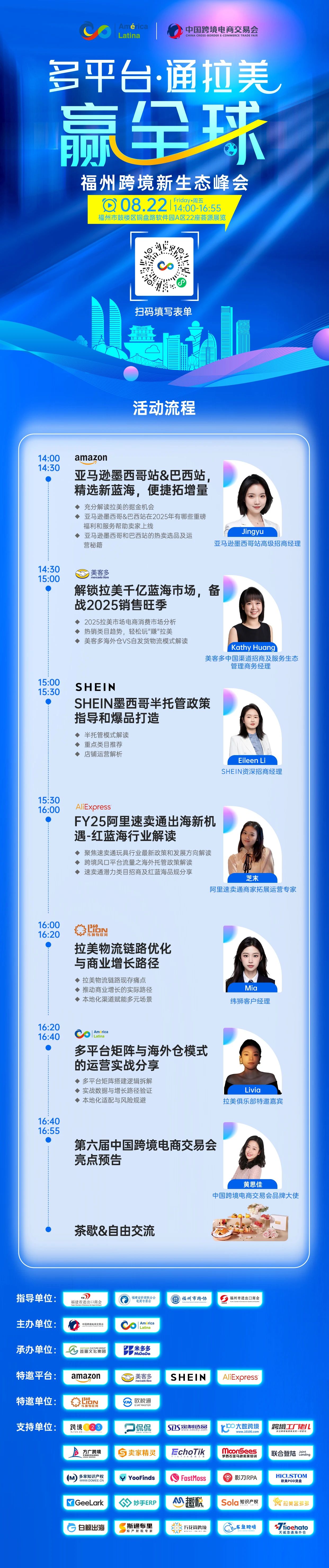 在此背景下,特组织举办本次活动,本次峰会汇聚亚马逊、美客多、速卖通、shein等平台大咖,还有拉美物流、卖家代表,深度剖析拉美掘金机会助力福州企业抢占拉美市场新蓝海。诚邀福州市跨境电商从业者,8月22日14:00相约鼓楼区铜盘路软件园A区22座荟源展览!